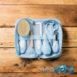 Descubre nuestro práctico neceser de aseo para bebé, que incluye un cepillo de cerdas naturales, peine, aspirador nasal, tijeras, 4 limas de uñas y cortauñas. Todo lo necesario para el cuidado y bienestar de tu pequeño en un solo kit.