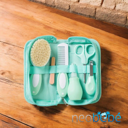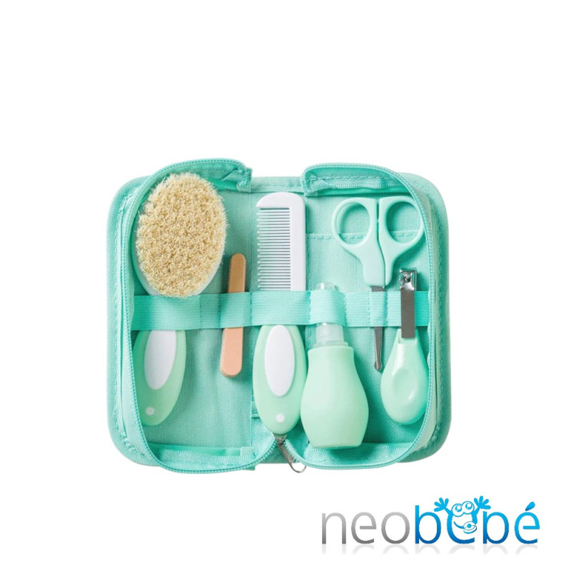 Descubre nuestro práctico neceser de aseo para bebé, que incluye un cepillo de cerdas naturales, peine, aspirador nasal, tijeras, 4 limas de uñas y cortauñas. Todo lo necesario para el cuidado y bienestar de tu pequeño en un solo kit.