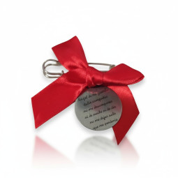 La medallita se presenta enganchada a un imperdible plateado con un bonito lazo rojo, un elemento tradicional que muchas familias utilizan para proteger al bebé del mal de ojo y atraer energía positiva.