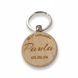 Este llavero está fabricado en madera natural y tiene un formato redondo de 3 cm, perfecto para llevar cómodamente en tus llaves, bolso o mochila sin ocupar espacio.