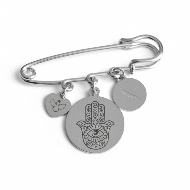 Hay detalles que van más allá de lo material… este colgante con alfiler dorado y medalla de la Mano de Fátima personalizado es un símbolo de protección, fe y amor para los más pequeños.