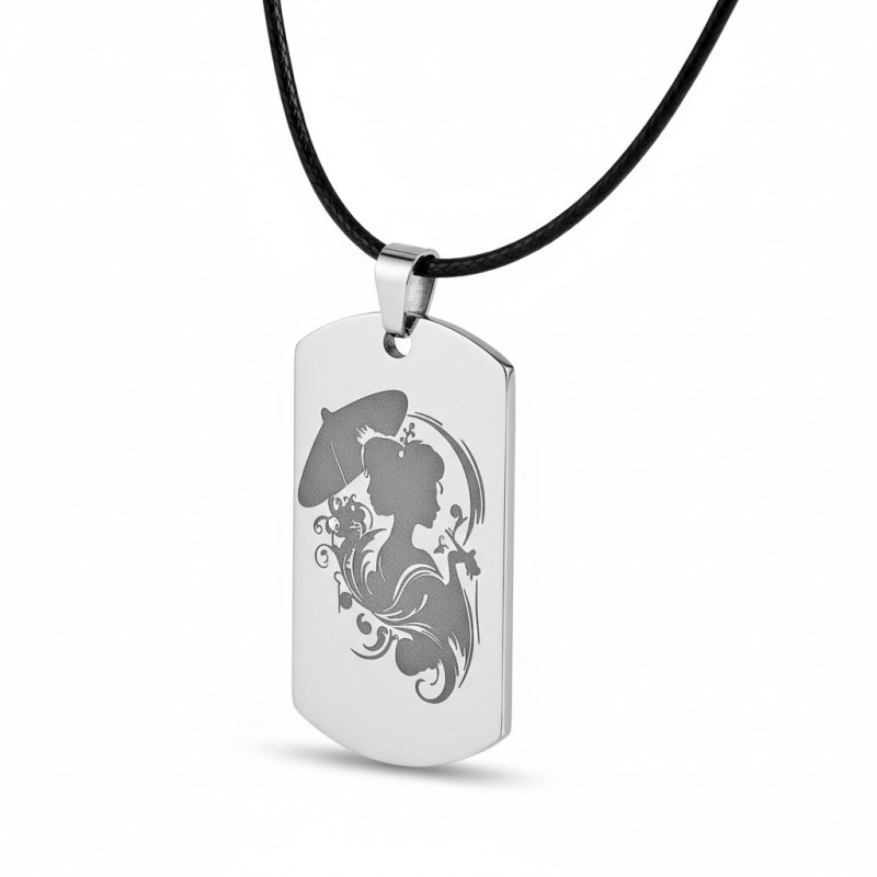 Colgante militar de acero con Geisha grabado a color personalizado, un accesorio único de 4,3 x 2,4 cm. Personalízalo con nombre y conviértelo en un regalo original y emocional que acompañará cada día a quien lo lleve