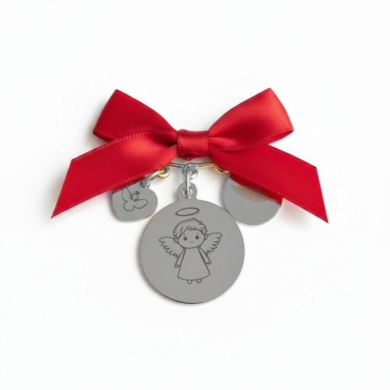Hay detalles que van más allá de lo material… este colgante con alfiler plateado y medalla del Ángel de la Guarda personalizado con lazo rojo es un símbolo de protección, fe y amor para los más pequeños.