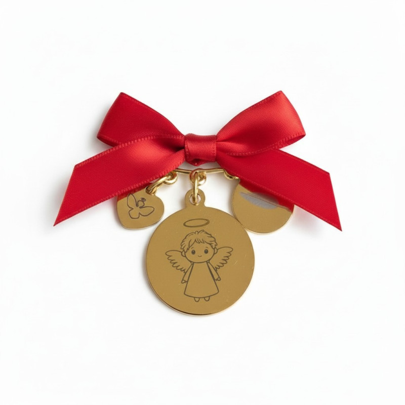 Hay detalles que van más allá de lo material… este colgante con alfiler dorado y medalla del Ángel de la Guarda personalizado con lazo rojo es un símbolo de protección, fe y amor para los más pequeños.